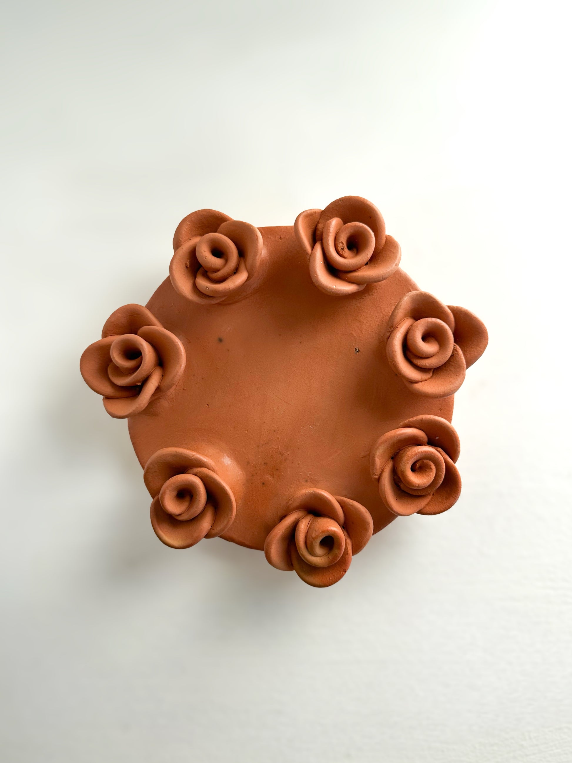 Handcrafted in Guatemala, this beautiful terracotta candle plate is adorned with seven delicate roses, each one carefully shaped by hand. Designed to hold pillar candles or veladoras, it adds a warm, artisanal touch to any space.