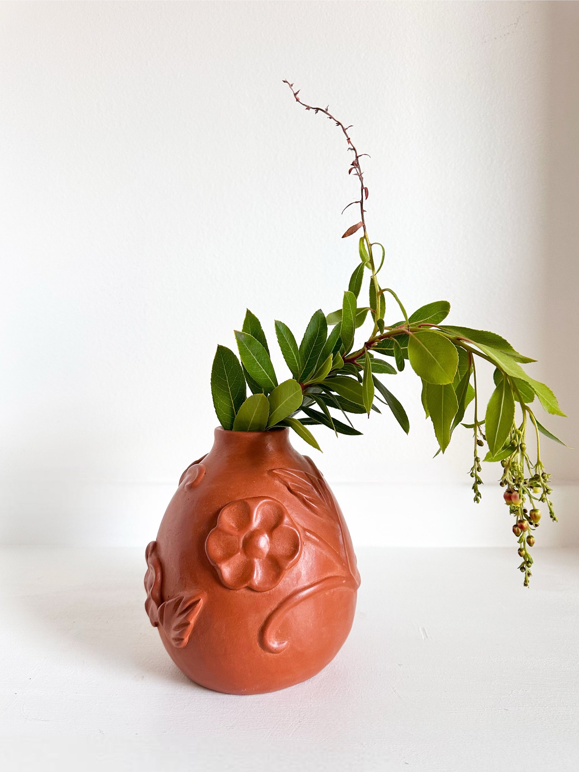 Clay vases are for decorative use only and are not sealed to hold water. The vase features intricate flower details all around sculpted by hand.